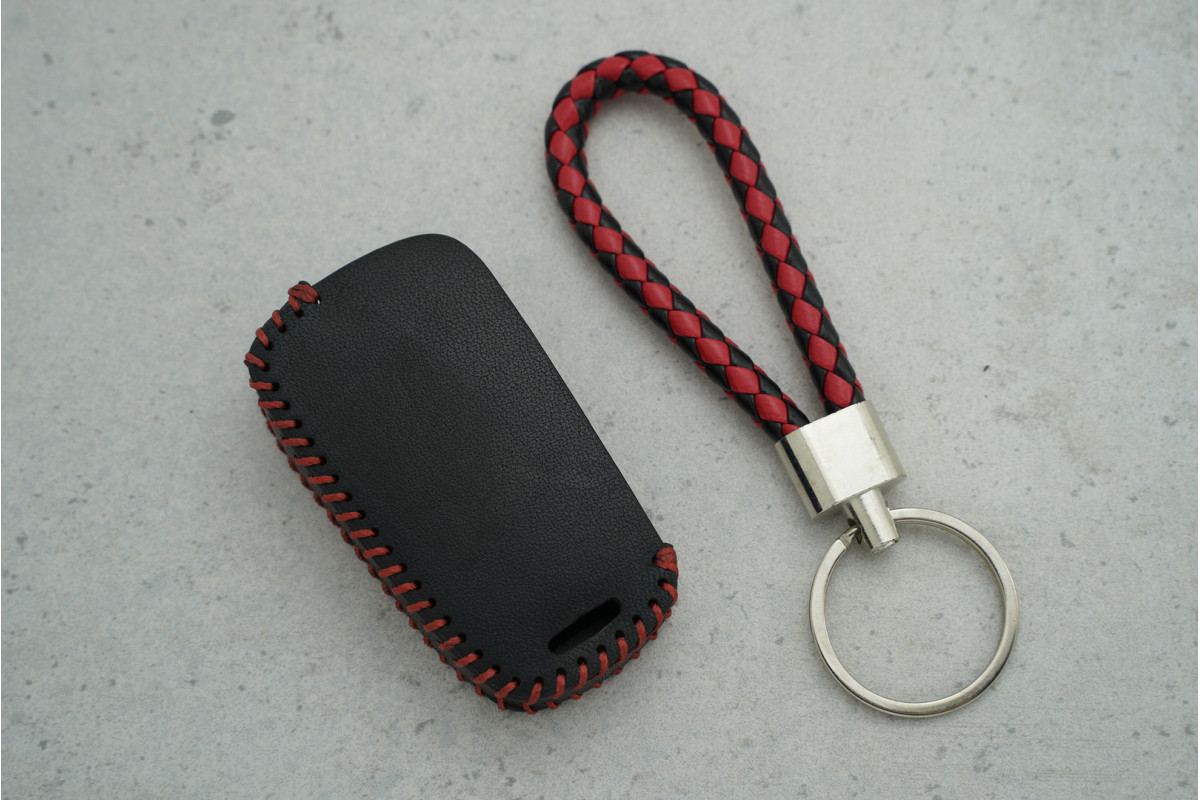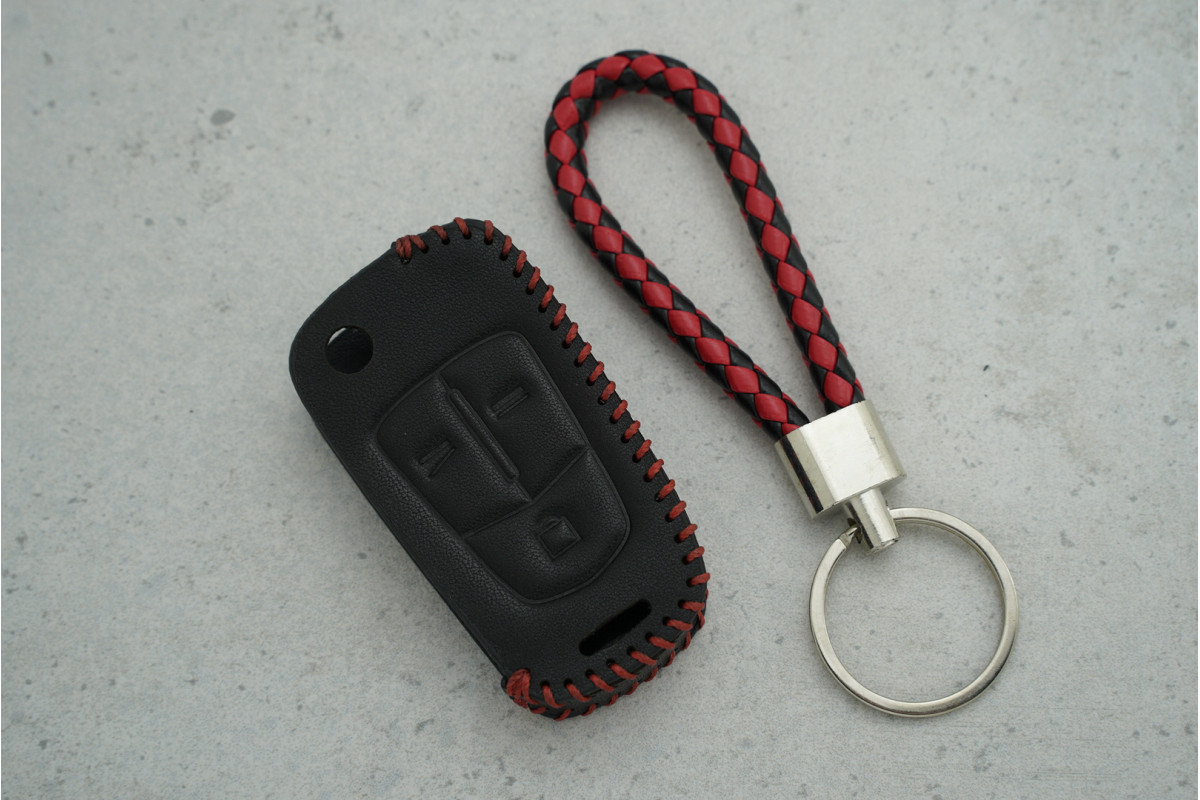 Чохол Opel на 3 кнопки, червоно-чорний, шкіряний з джгутом — стильний та практичний аксесуар для захисту ключа від подряпин і зносу, що забезпечує зручність у повсякденному використанні.