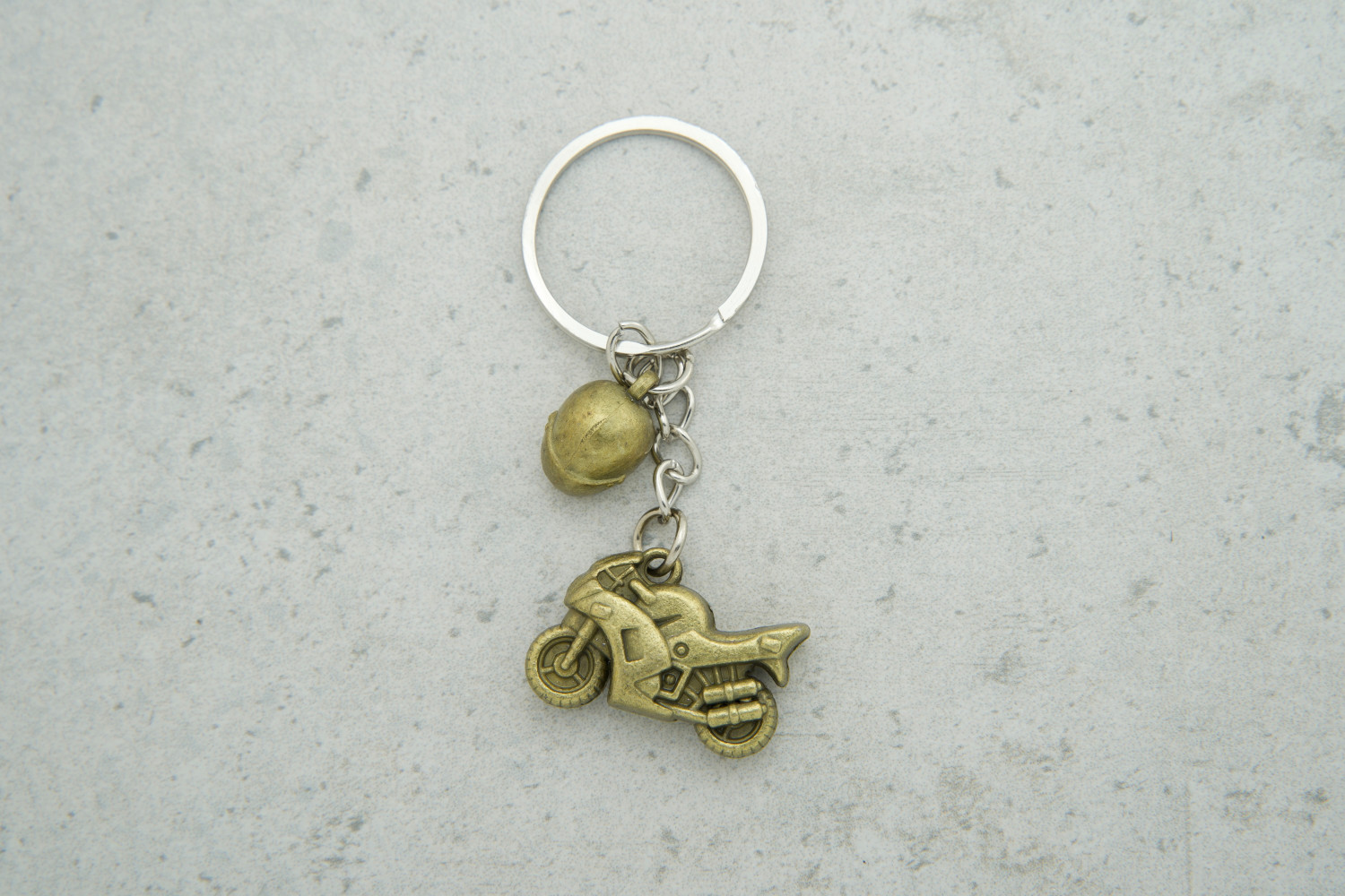 Брелок "Мотоцикл з шоломом" металевий латунного кольору — компактний та стильний аксесуар для ключів із мототематикою.