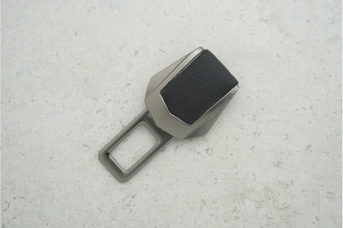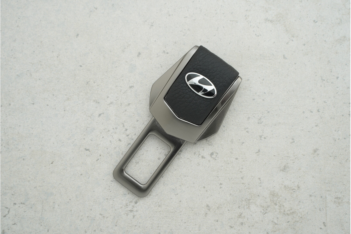 Заглушка ременя безпеки Hyundai у графітовому металі зі шкіряним елементом — компактний аксесуар, що дозволяє вимкнути сигнал нагадування про ремінь і додає стильний акцент у салон автомобіля.