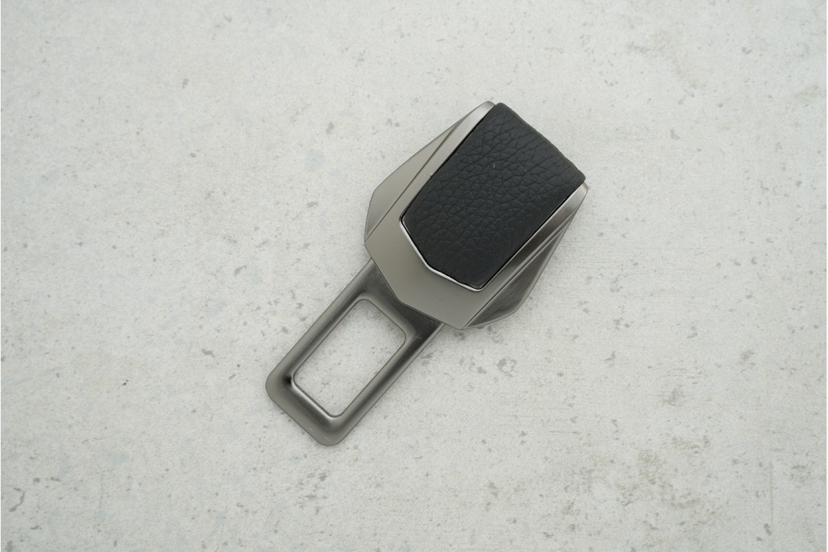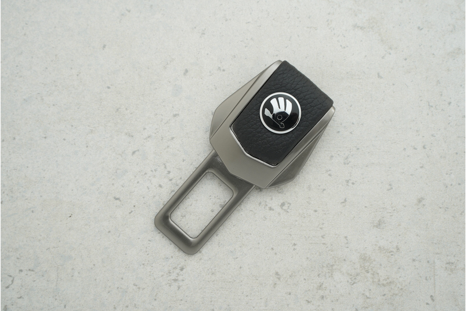 Заглушка ременя безпеки для Skoda у графітовому металі зі шкіряним елементом — компактний та стильний аксесуар, що дозволяє швидко вимкнути сигнал нагадування про ремінь і підкреслює преміальний вигляд салону.