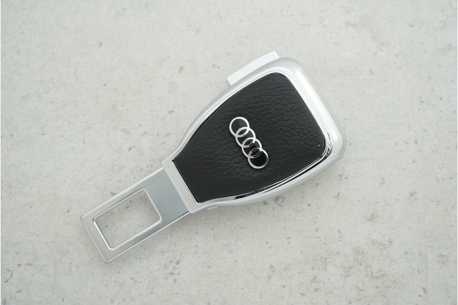 Заглушка ременя безпеки Audi з металу з шкіряним елементом — компактний і стильний аксесуар, що допомагає швидко блокувати сигнал нагадування про ремінь та додає елегантності салону автомобіля.