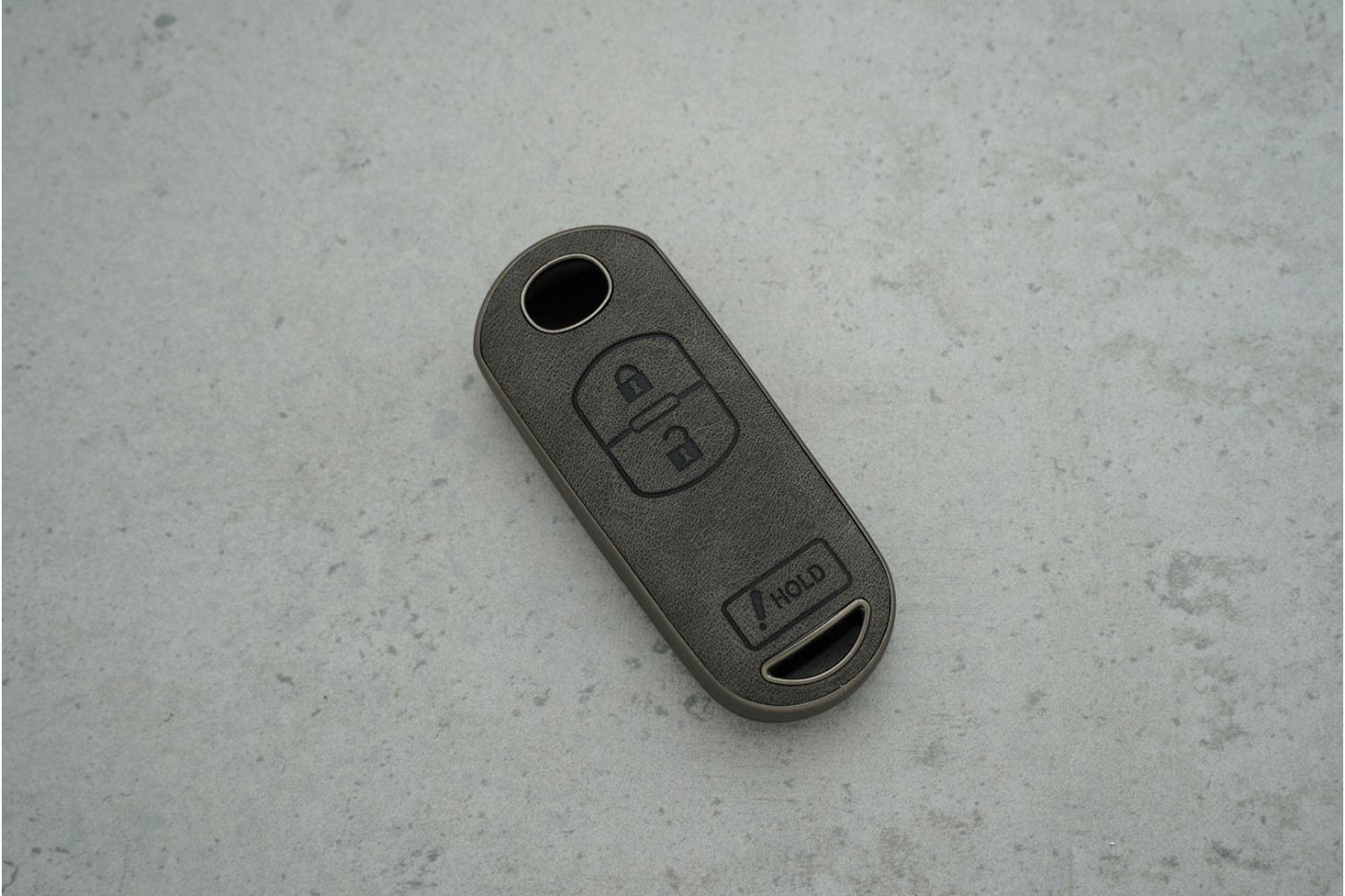 Чохол для пульта Mazda на 2 кнопки, сірий з вставками з екошкіри та поліуретану — практичний аксесуар для захисту пульта від подряпин, зносу та забруднень, який допомагає зберегти його охайний вигляд у щоденному користуванні.