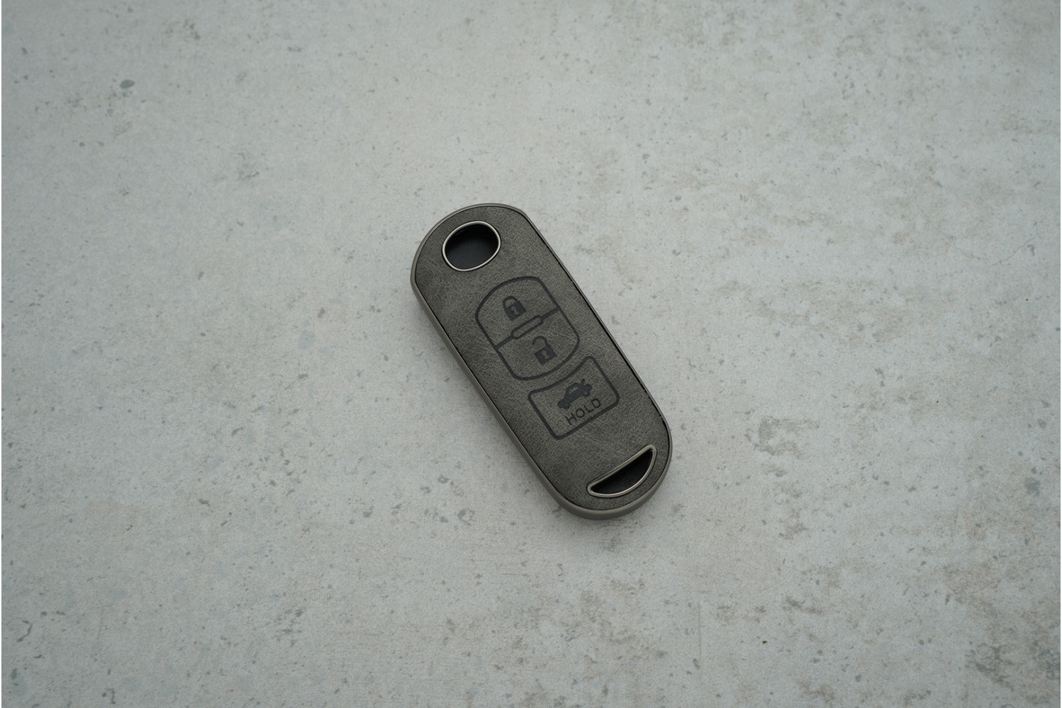 Чохол для автоключа Mazda 3 кнопки сірого кольору з екошкіряними вставками та поліуретаном — практичний аксесуар, який поєднує надійний захист ключа з акуратним і сучасним дизайном.