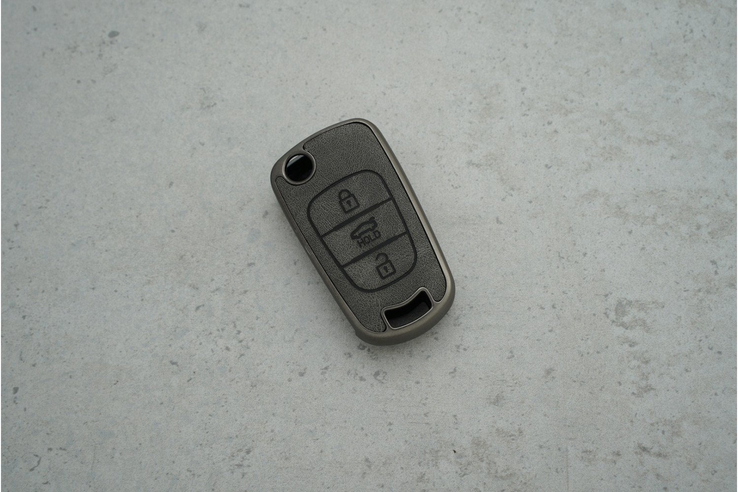 Чохол для пульта Kia/Hyundai на 3 кнопки, сірий з вставками з екошкіри та поліуретану — практичний аксесуар, що захищає пульт від подряпин, пилу та зносу, одночасно оновлюючи його зовнішній вигляд.