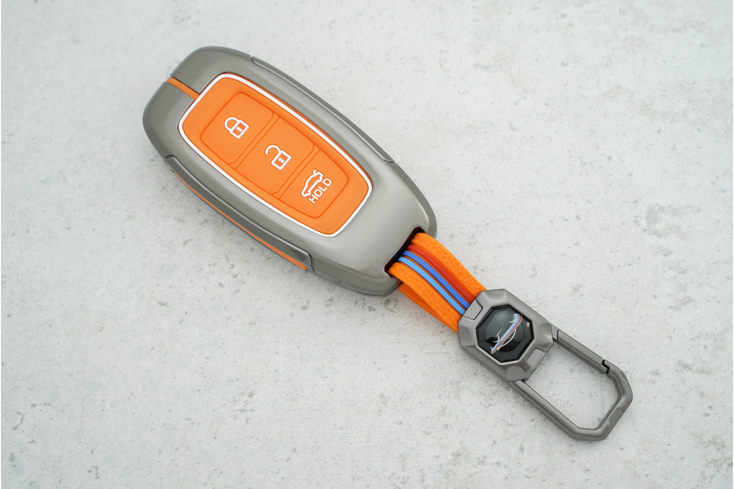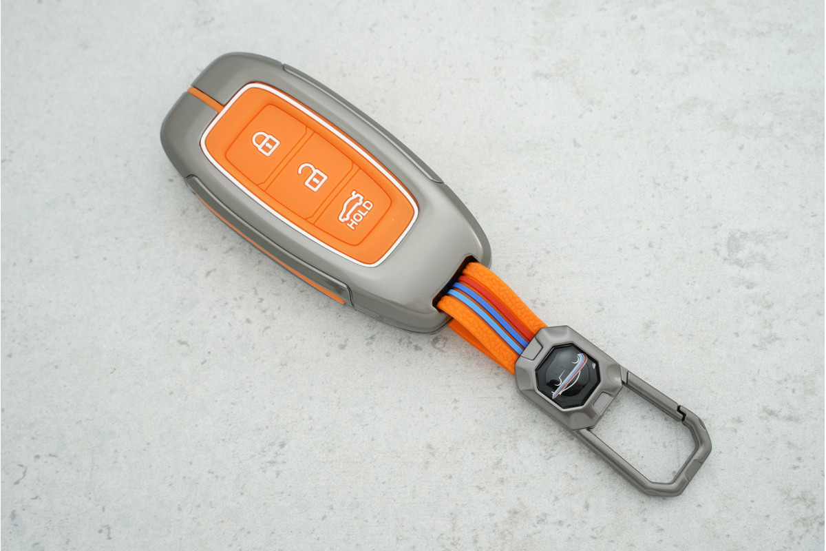 Чохол Hyundai 2+1 кнопки метал + силікон орандж для Kona 2020 — надійний аксесуар для захисту автомобільного ключа, який поєднує міцну металеву основу з еластичним силіконом та яскравим дизайном.