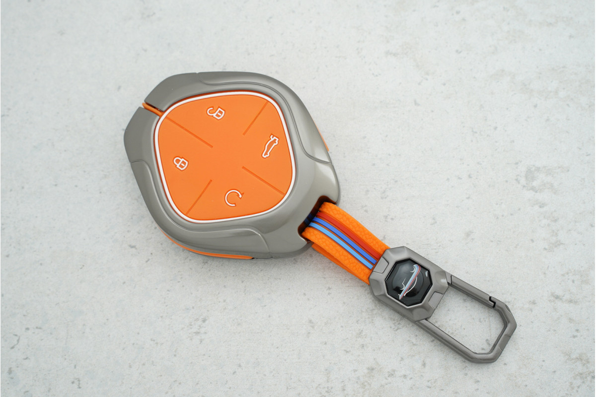 Чохол Jetour на 4 кнопки з металу та помаранчевого силікону — практичний аксесуар для захисту смарт-ключа, який поєднує міцність і яскравий зовнішній вигляд.