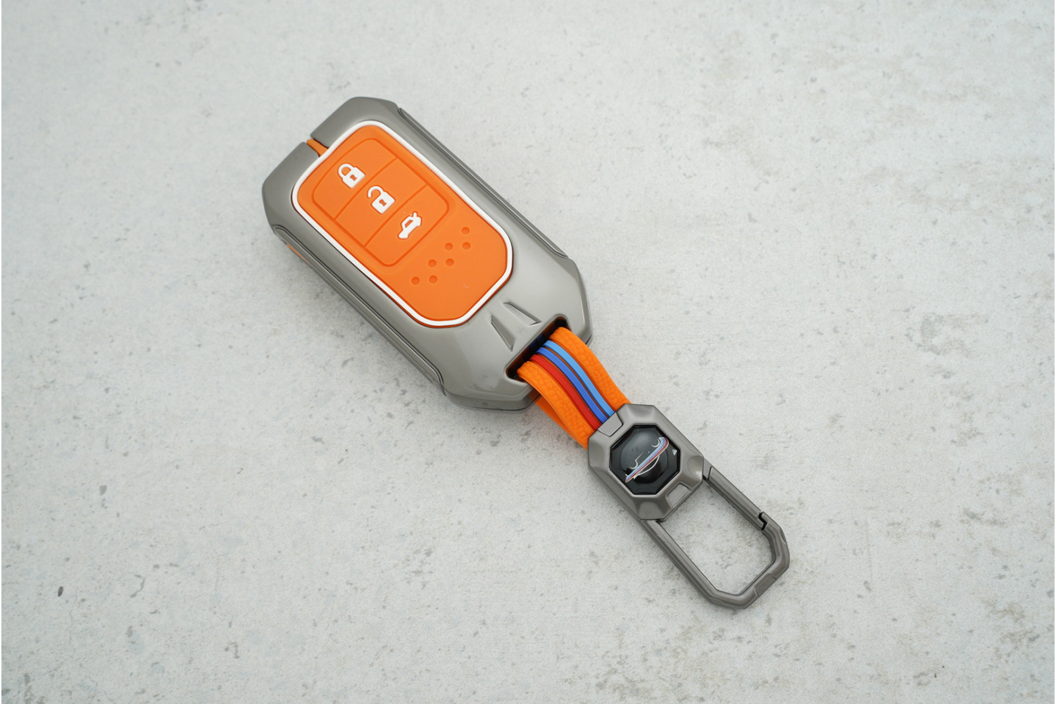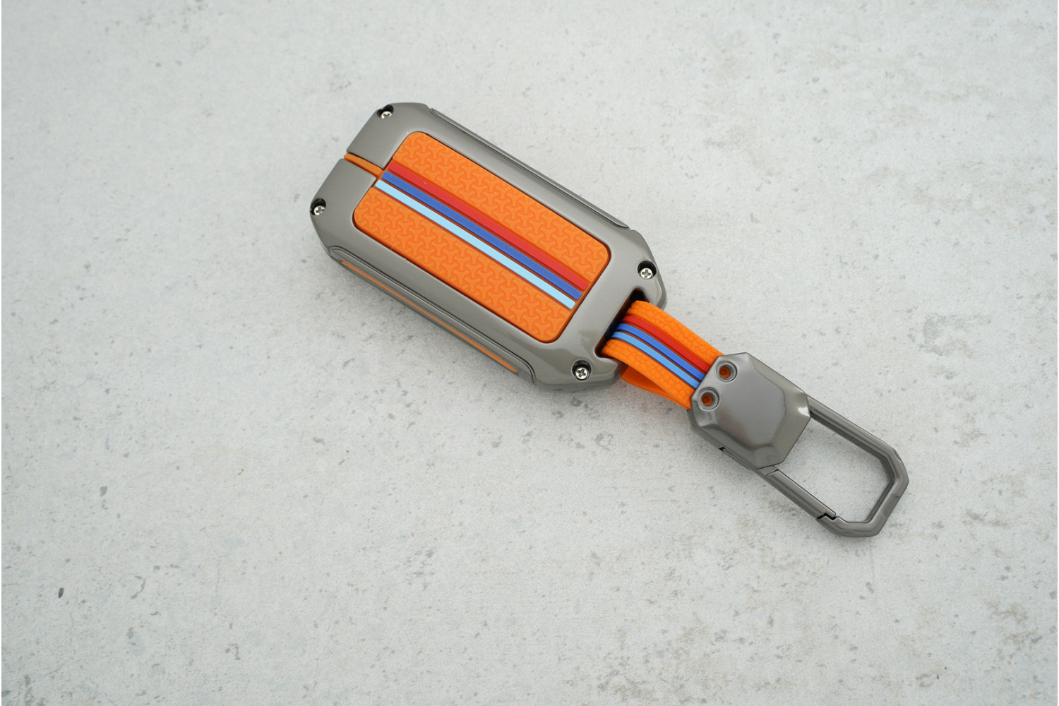 • Стильний дизайн: Помаранчевий силікон із металевими вставками додає ключу сучасного та яскравого вигляду.
