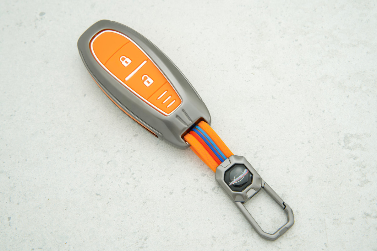 Чохол на автопульт Suzuki 2 кнопки (Vitara, Fengyu, Qiyue, Xiaotu), помаранчевий, силікон + метал — яскравий та надійний аксесуар, який захищає ключ від подряпин, пилу та зносу, одночасно підкреслюючи індивідуальний стиль.