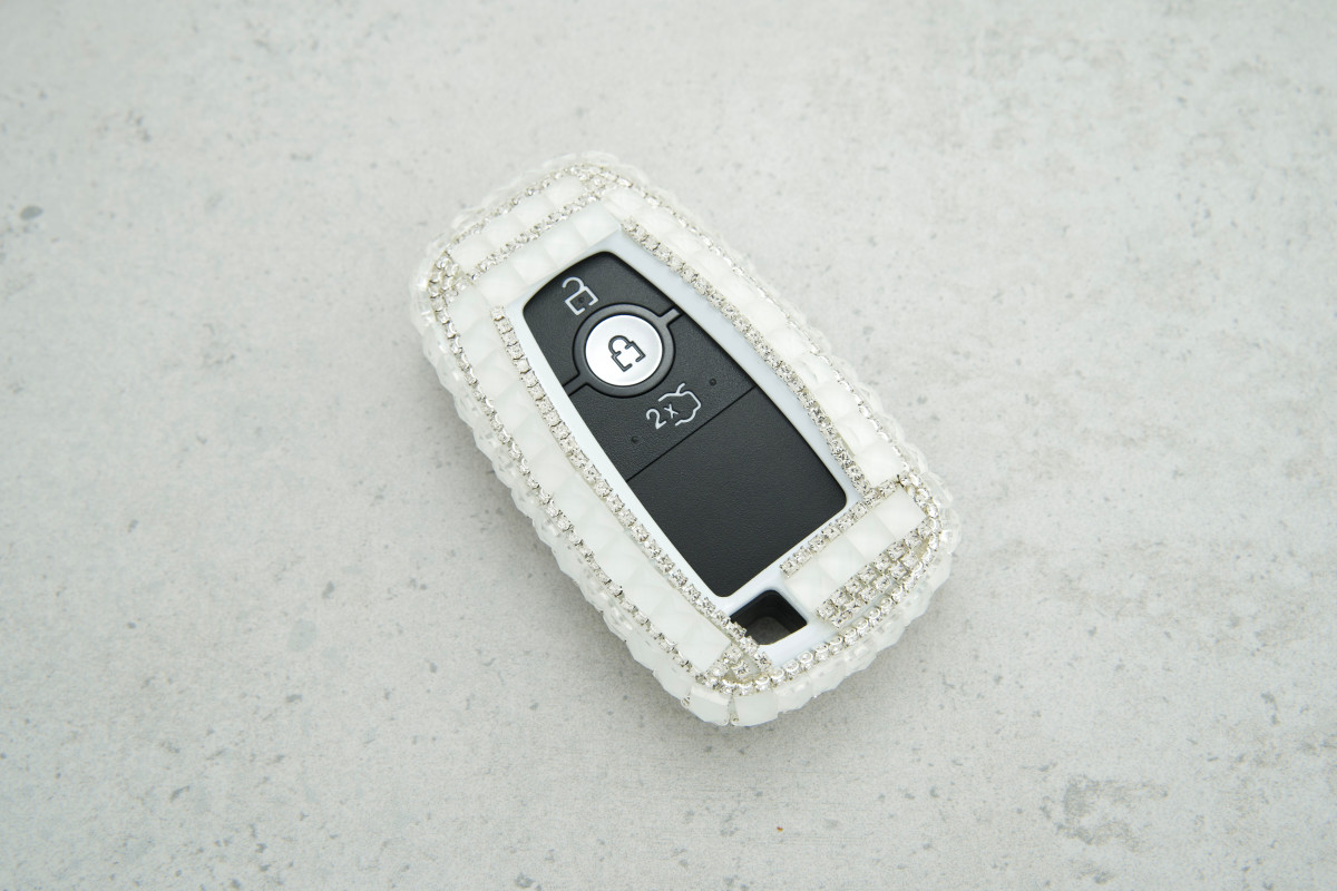 Чохол на автопульт Ford 2/3/4 кнопки, великі стрази, білий — яскравий та захисний аксесуар, який оберігає ключ від подряпин і забруднень, надаючи йому елегантного вигляду.