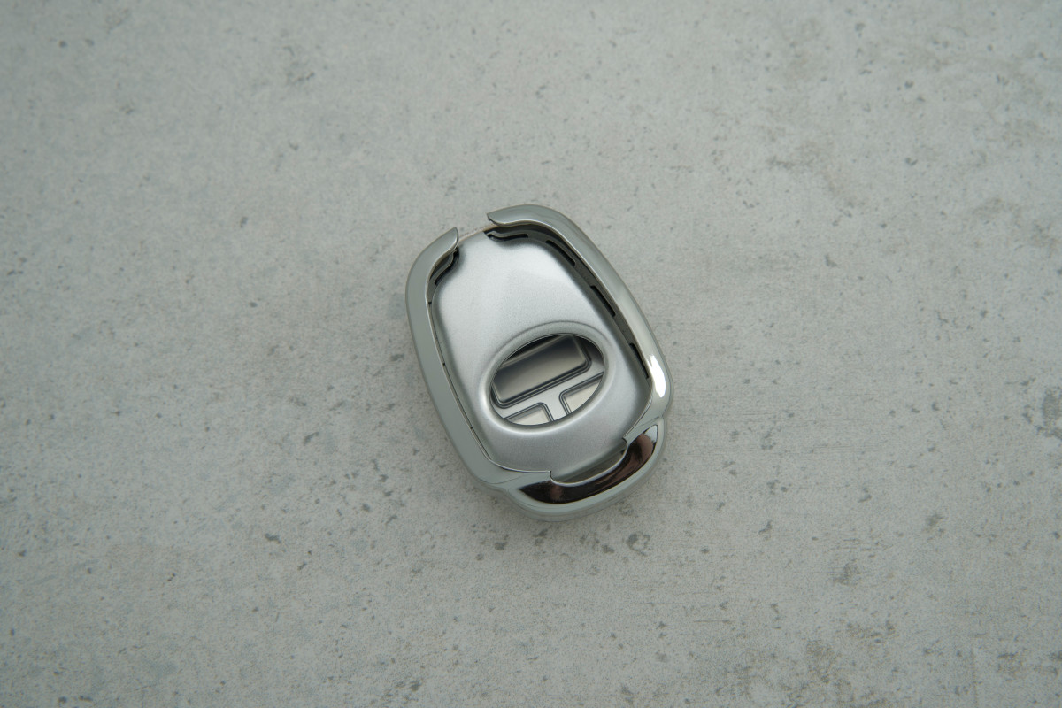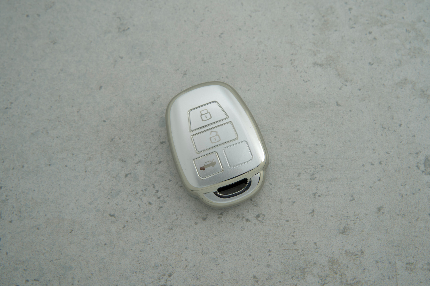 Чохол Toyota 3 кнопки сірий-срібло з поліуретану — надійний і стильний захист для ключів Toyota Camry та Corolla, що поєднує міцний матеріал і сучасний елегантний вигляд.