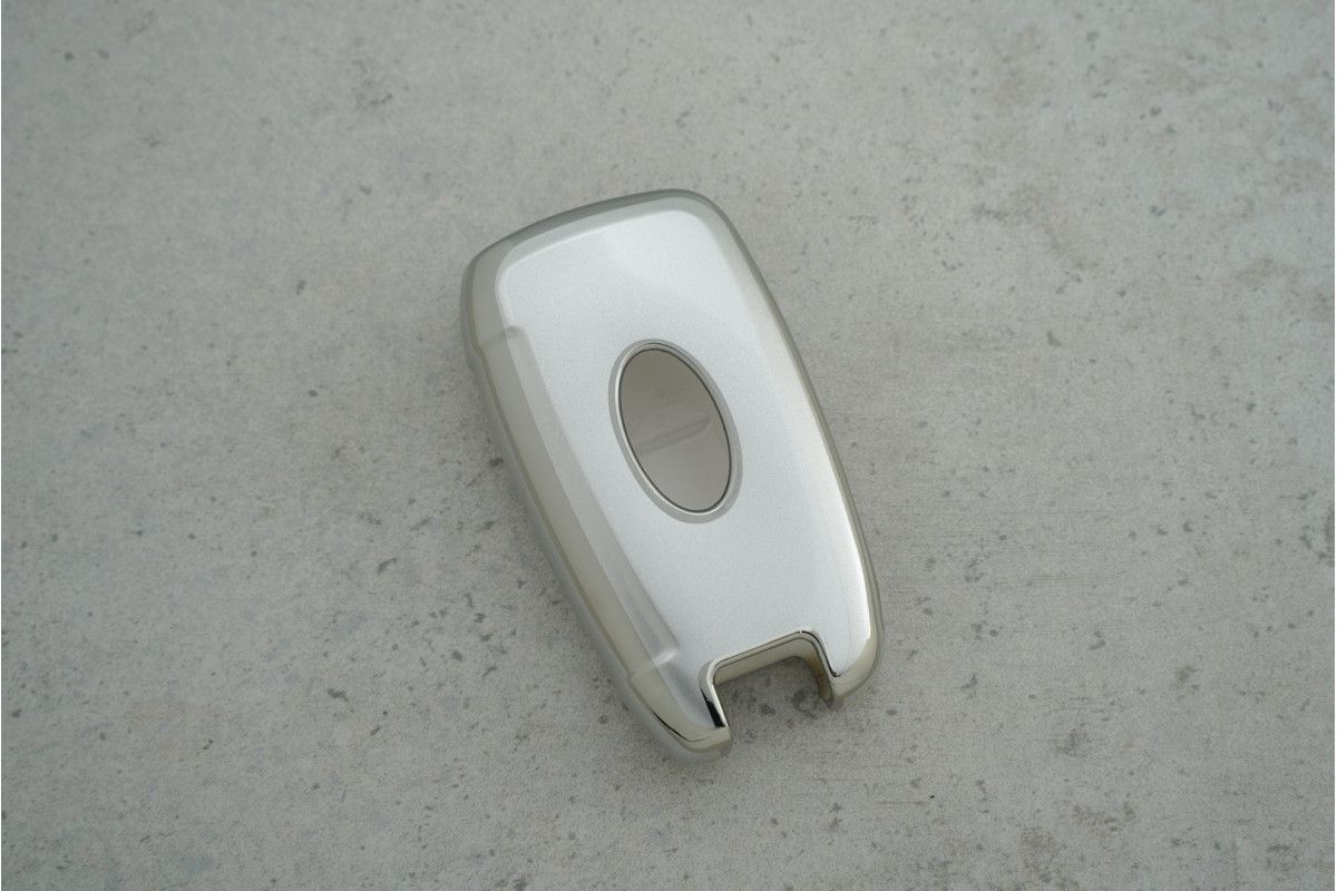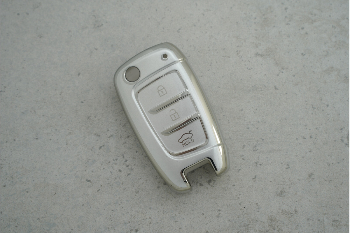 Чохол Hyundai на 3 кнопки для Sonata сірого-сріблястого кольору з поліуретану — практичний та стильний аксесуар, який надійно захищає ключ від подряпин і пошкоджень, зберігаючи при цьому елегантний вигляд.