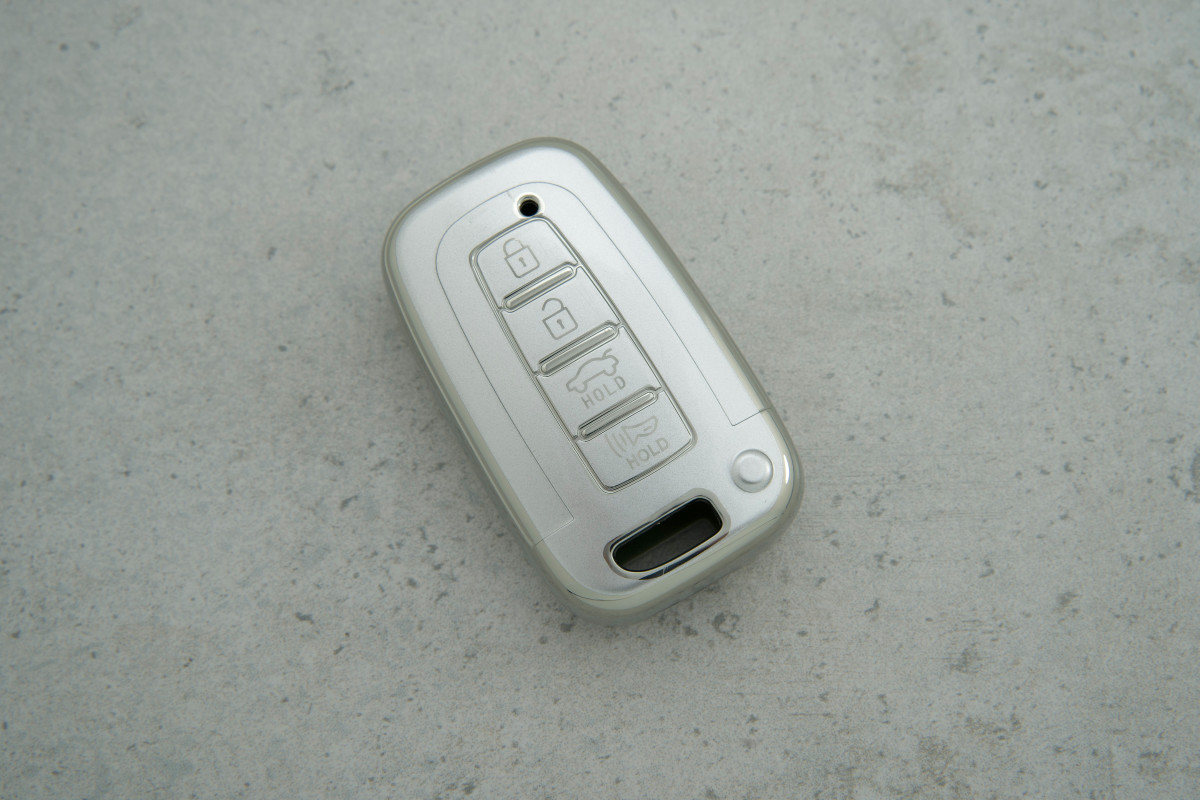 Чохол Hyundai 3+1 кнопки сірий-срібло з поліуретану — надійний та стильний захист ключа для моделей Solaris та Sonata, що поєднує міцність матеріалу та сучасний дизайн.
