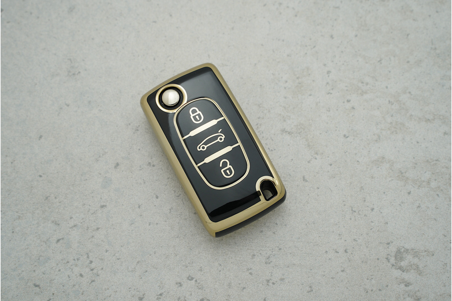 Чохол Peugeot 3 кнопки чорний-золото забезпечує надійний захист ключа та стильний вигляд щодня.
