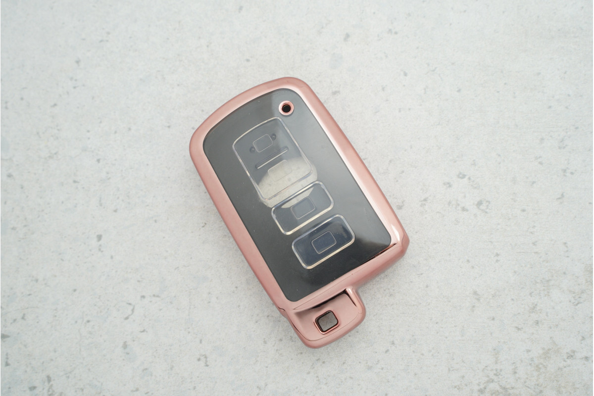 Чохол Toyota для Land Cruiser 200 рожевий прозорий з поліуретану — яскравий та практичний аксесуар для захисту ключа, який поєднує ніжний колір і надійну фіксацію, зберігаючи оригінальний вигляд смарт-ключа.