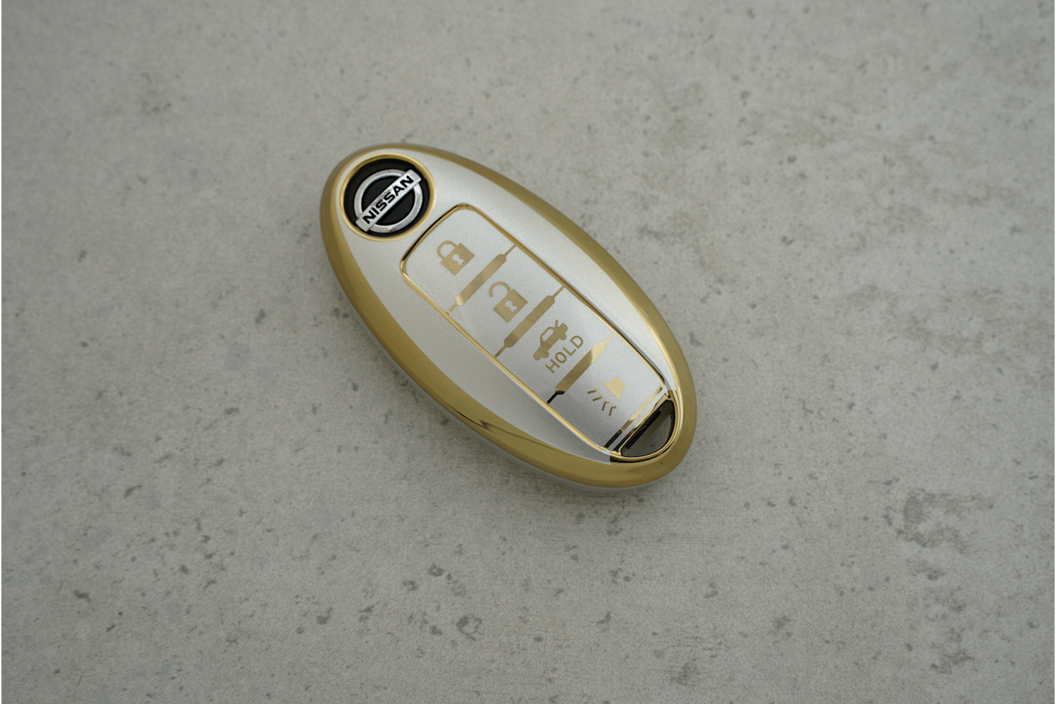 Чохол Nissan 3+1 кнопки сірий-золотий з поліуретану — стильний та надійний аксесуар для ключів моделей Qashqai, Juke J10 та Trail, який забезпечує захист від пошкоджень і додає сучасного вигляду.
