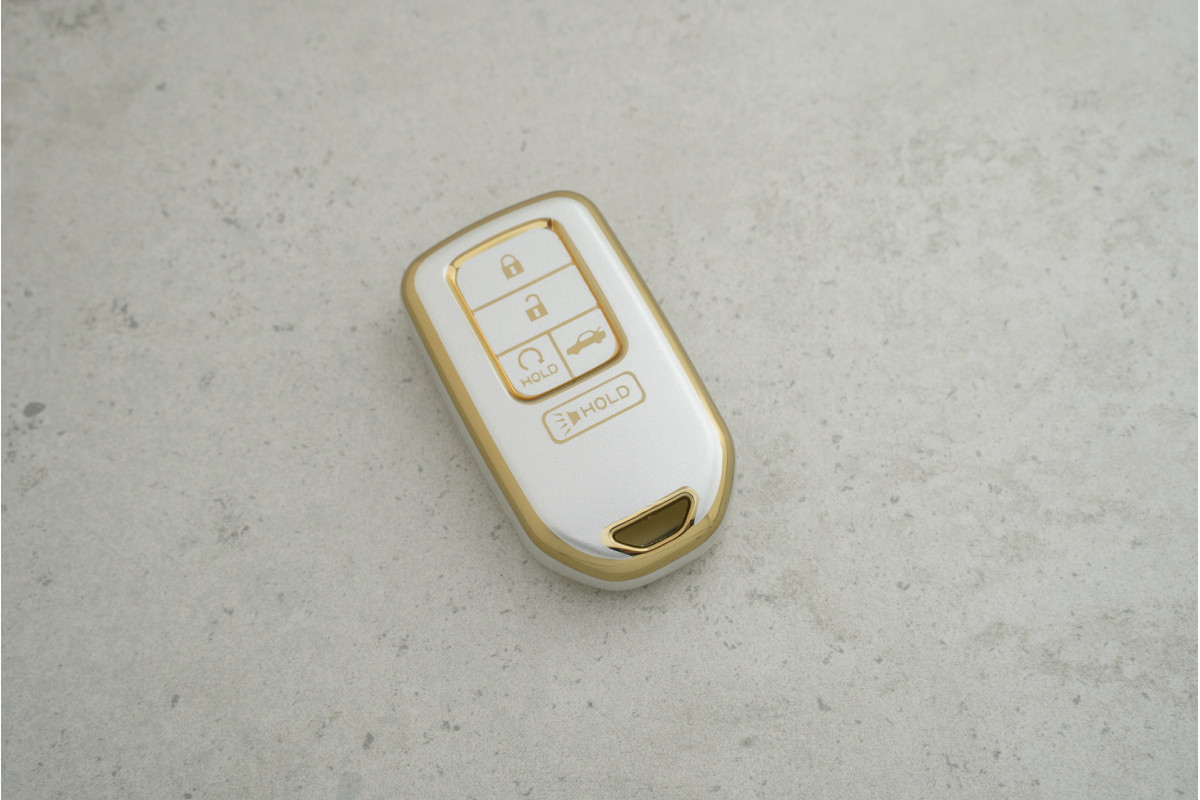 Чохол Honda на 4+1 кнопки сірий-золото з поліуретану — елегантний і практичний аксесуар, що захищає ключ від подряпин, потертостей і випадкових пошкоджень, водночас підкреслюючи преміальний вигляд автомобіля.
