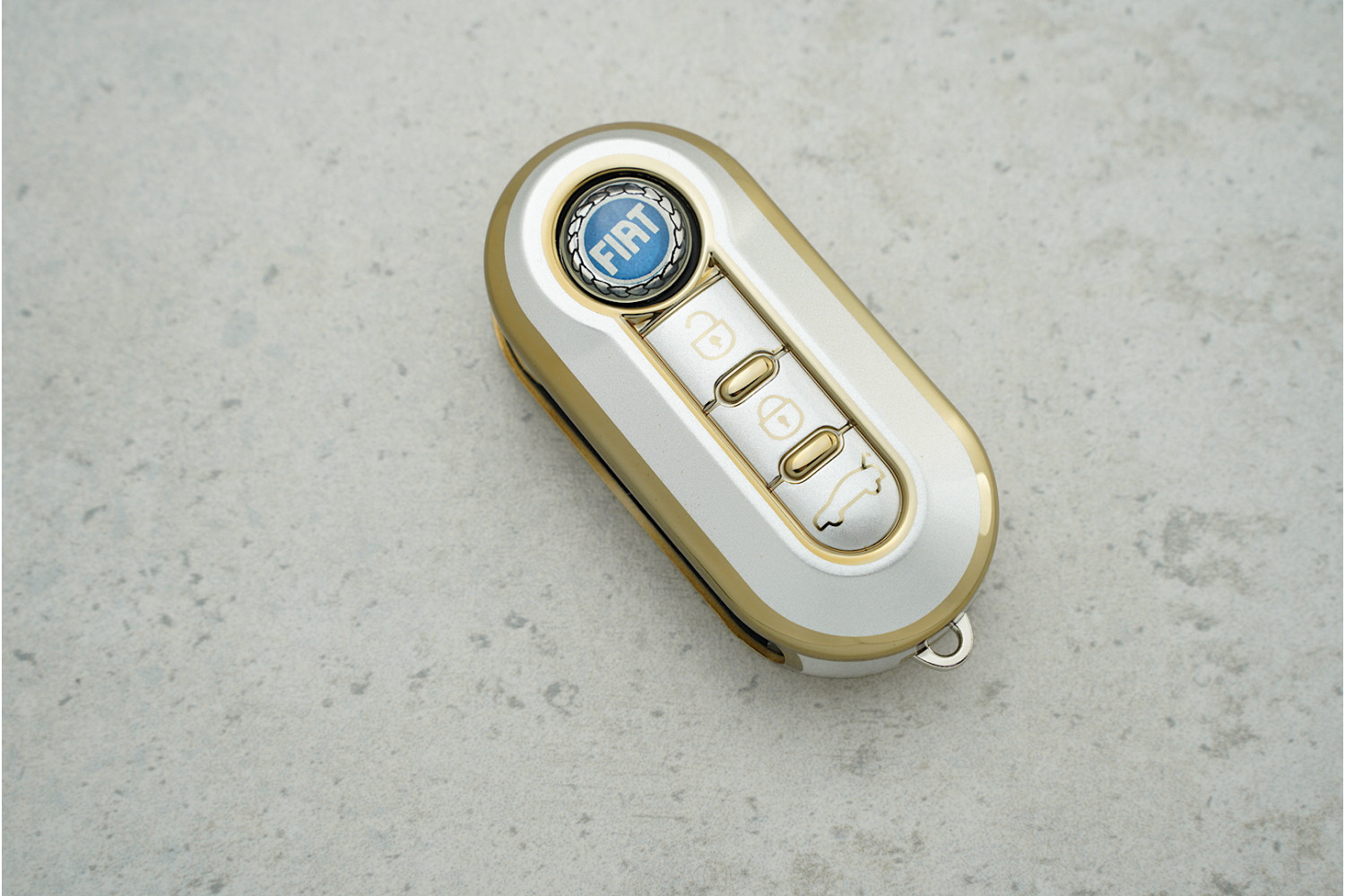Чохол Fiat 3 кнопки сірий-золото з поліуретану — стильне та практичне рішення для захисту ключа, яке допомагає зберегти його зовнішній вигляд і зручність у щоденному користуванні для моделей Punto та Doblo.