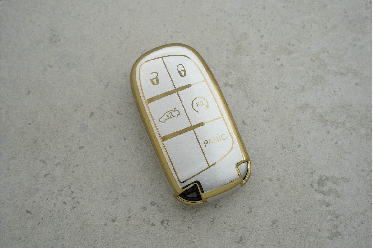 Чохол JEEP / Chrysler / Dodge / Fiat на 4+1 кнопки сірий-золотий з поліуретану — стильний та надійний аксесуар для ключів, який поєднує щоденний захист від пошкоджень із сучасним преміальним виглядом.