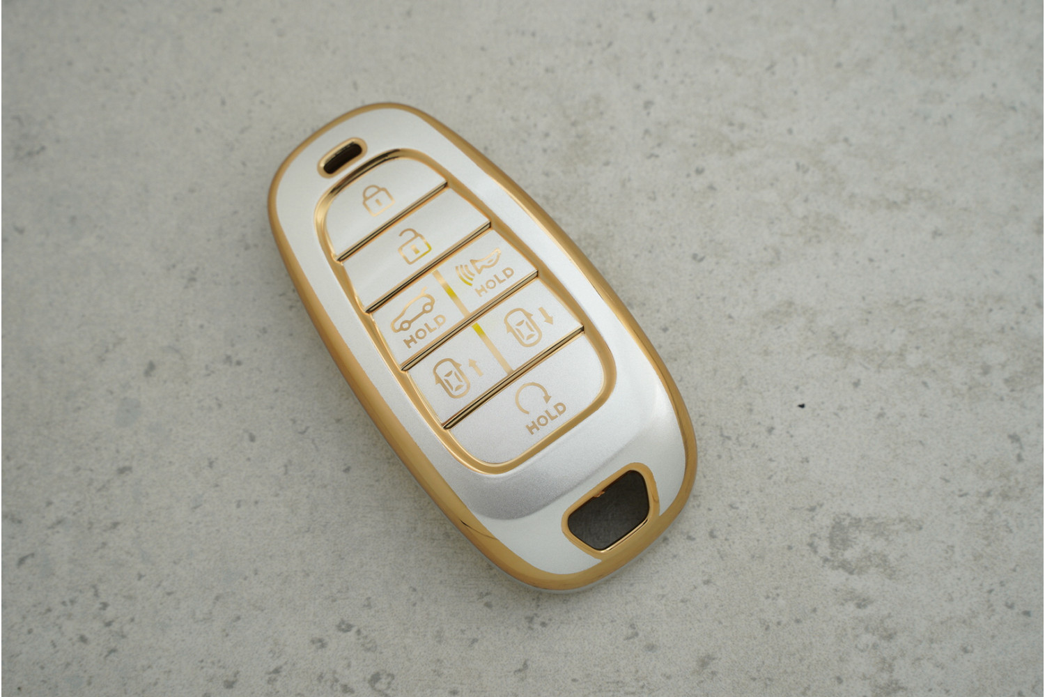 Чохол Hyundai сірий-золото поліуретан на 6+1 кнопок для моделей Tucson — міцний і стильний аксесуар для захисту ключа від подряпин і пошкоджень, що зберігає його елегантний вигляд.