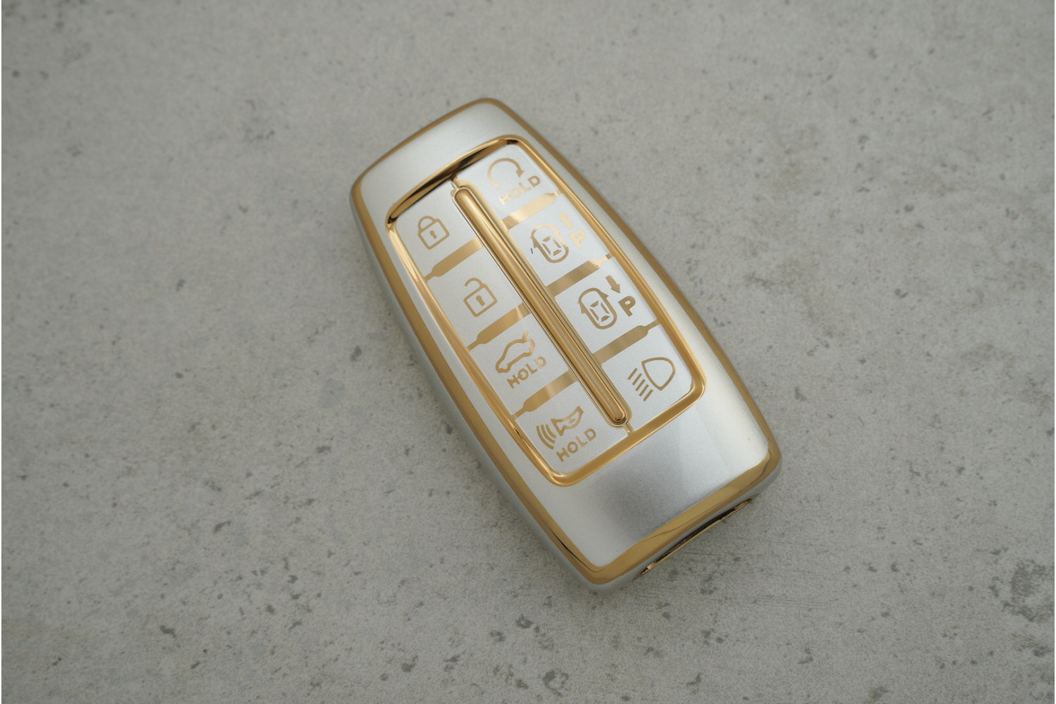 Чохол Hyundai сірий-золото поліуретан на 7+1 кнопки для Veloster — компактний захисний аксесуар для ключа, що оберігає його від подряпин та щоденного зносу, зберігаючи стильний вигляд.