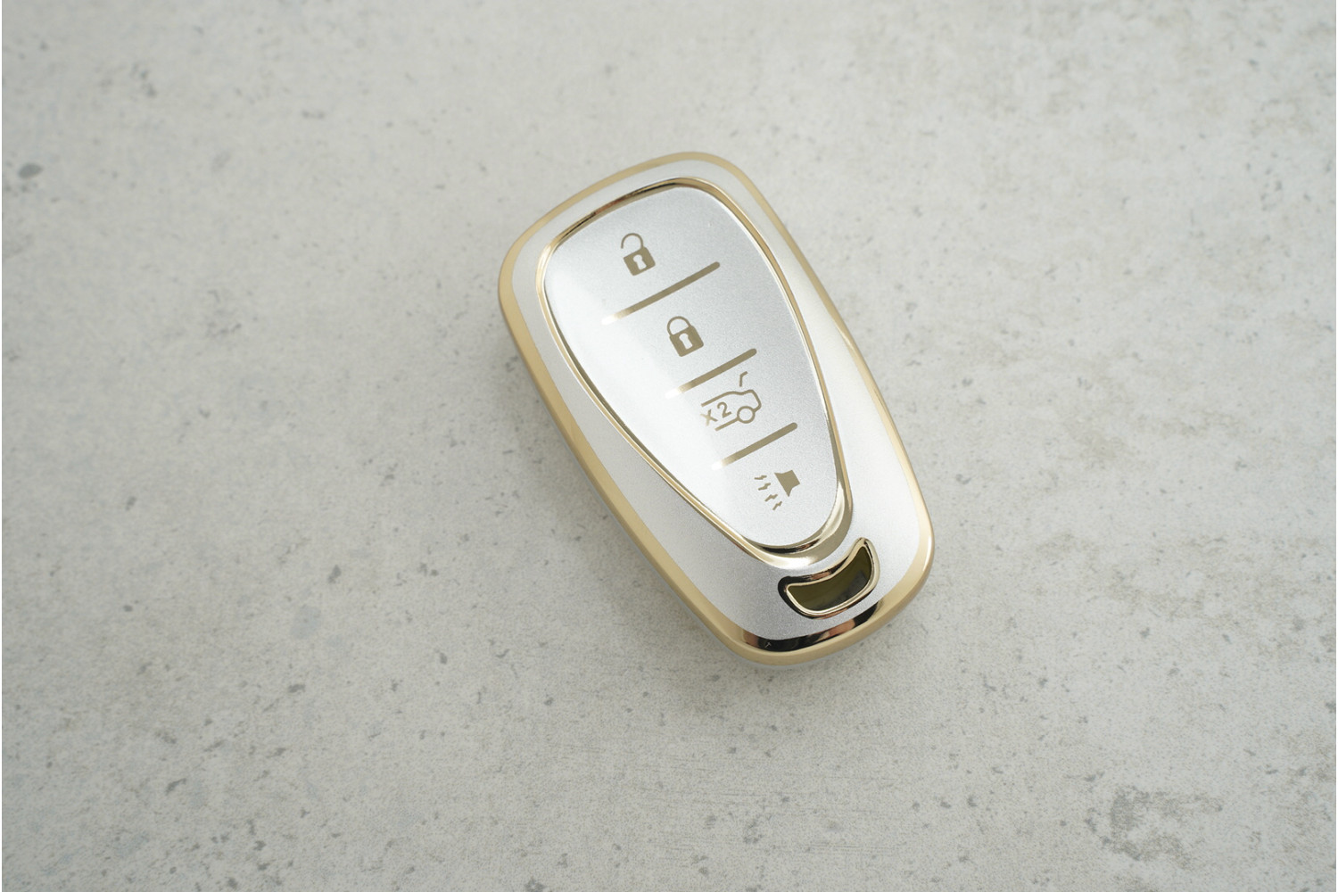 Чохол Chevrolet 3+1 кнопки сірий-золото надійно захищає ключ і робить його вигляд більш сучасним та привабливим у повсякденному використанні.
