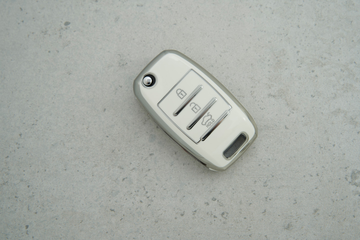Чохол KIA біло-сірий з поліуретану на 3 кнопки для Sportage (Америка) — практичний та стильний аксесуар, що надійно захищає ключ від подряпин, ударів та щоденного зношування, поєднуючи комфорт і естетику.