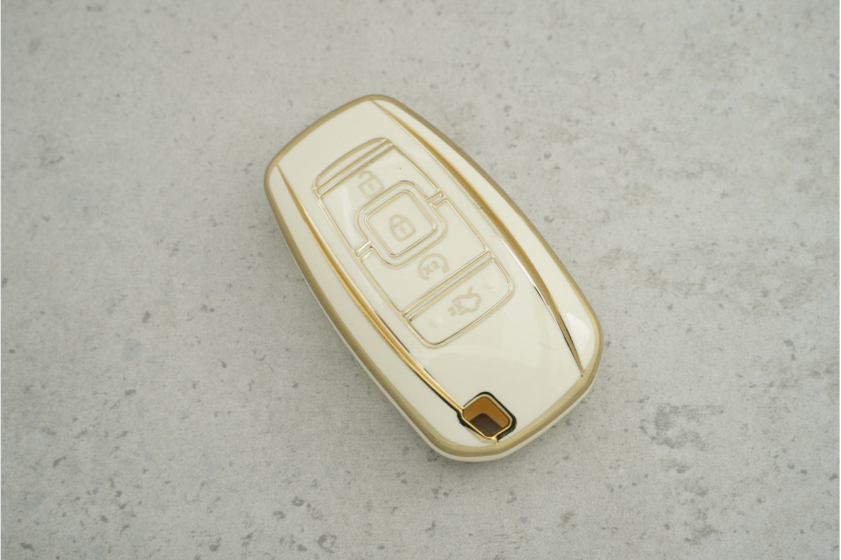 Чохол Lincoln біло-золотий поліуретан на 4 кнопки для MKC, MKZ та MKX 2018 — елегантний аксесуар, що поєднує надійний захист ключа та стильний вигляд, зберігаючи комфорт і практичність у щоденному використанні.