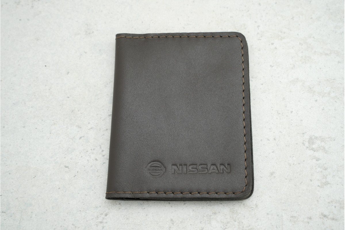 Обкладинка-картхолдер Nissan темно-коричневий зі шкіри — елегантний аксесуар для зберігання карток та документів, що поєднує практичність і преміальний вигляд у щоденному використанні.