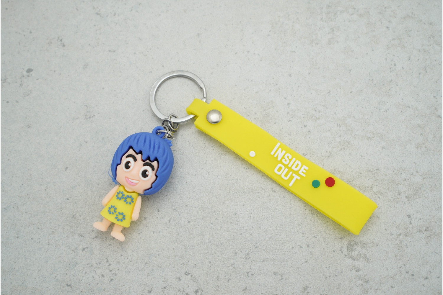 • Стильний дизайн: Яскравий жовтий ремінець з написом INSIDE OUT робить брелок помітним і веселим акцентом.