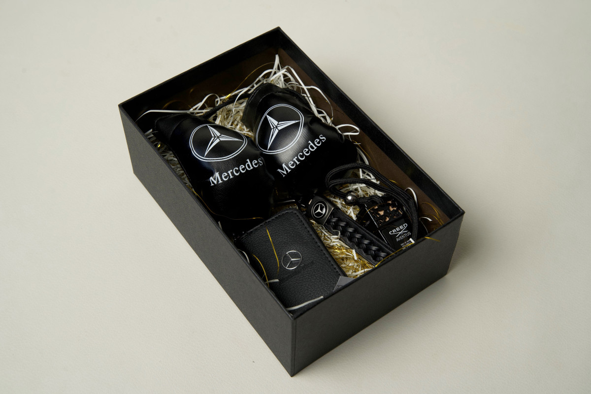 Подарунковий набір MERCEDES 4в1+ (автоключниця + брелок + ароматизатор + аксесуар — боксерські рукавички для дзеркала) — стильний і практичний комплект для справжніх шанувальників автомобільного бренду Mercedes.