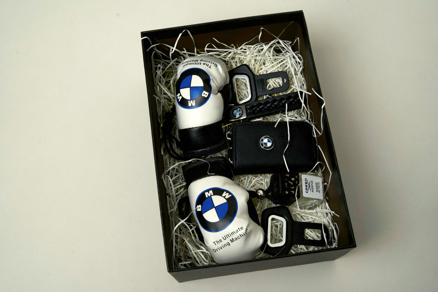 Подарунковий набір BMW 5в1 (рукавички-аксесуар для центрального дзеркала, брелок BMW, автомобільний ароматизатор, автоключниця та заглушки для ременів безпеки) — це стильний і функціональний комплект, створений для поціновувачів марки BMW.