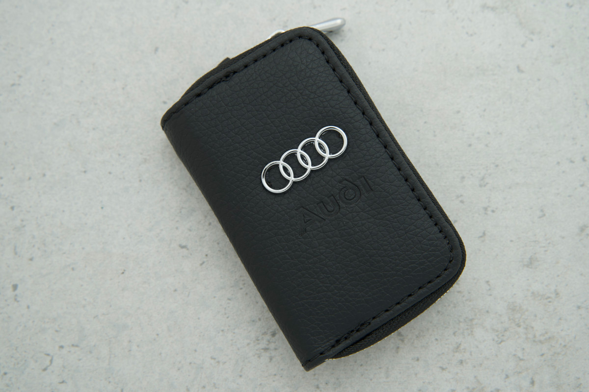 Ключниця-чохол Audi чорного кольору зі шкіри — компактний та стильний аксесуар для зручного зберігання ключів, що захищає їх від подряпин і підтримує порядок у кишені чи сумці.