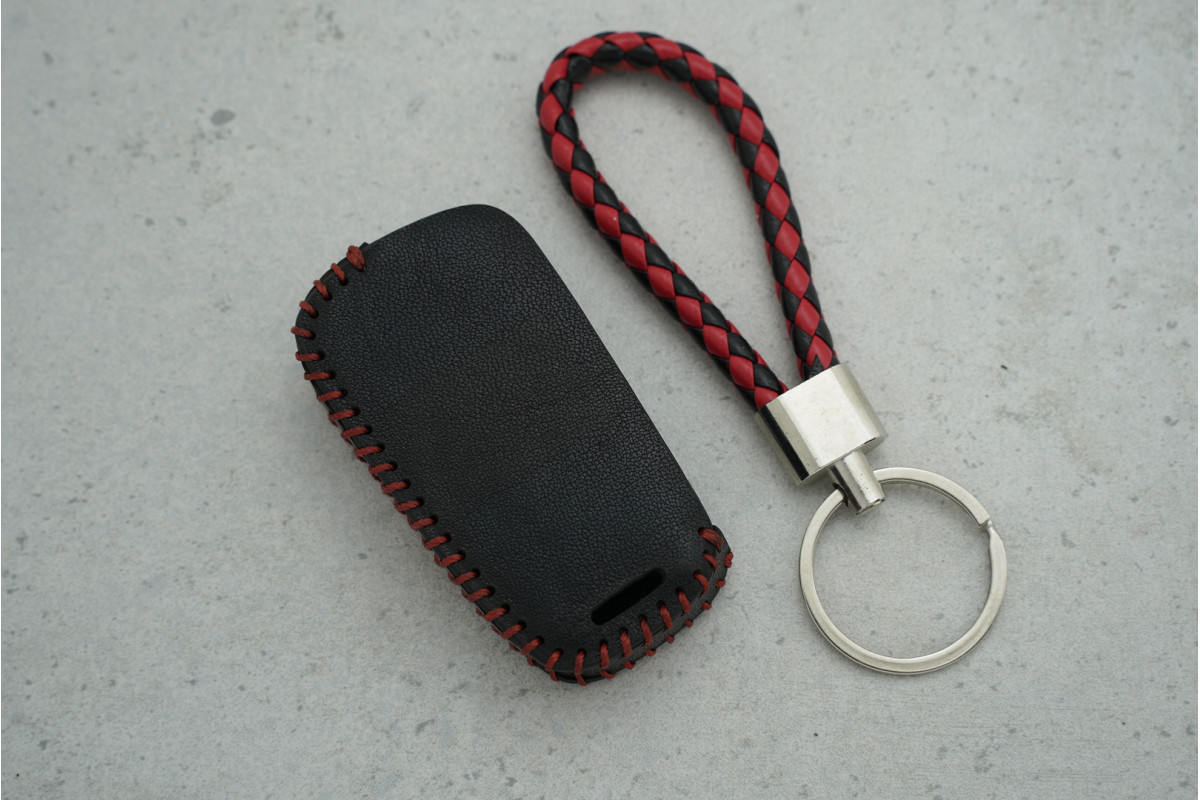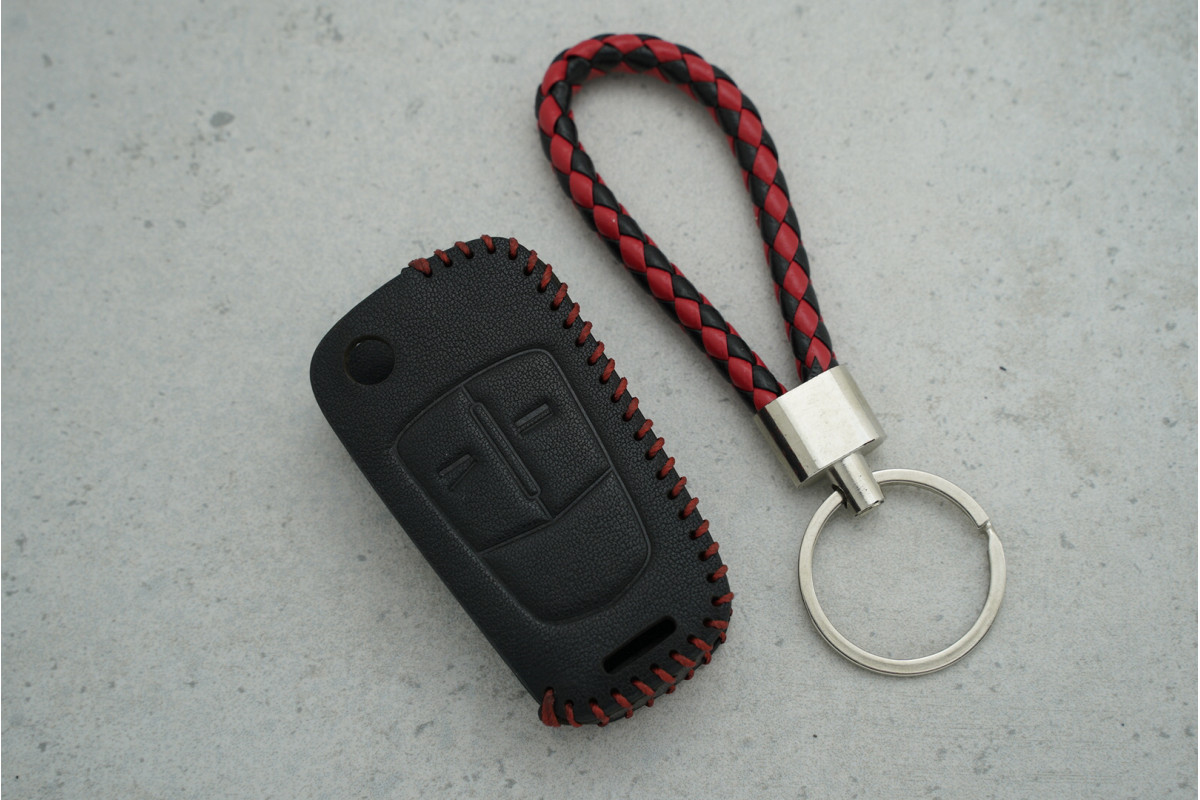 Чохол для ключа Opel, червоно-чорний шкіряний (з джгутом), 2 кнопки — стильний і захисний аксесуар, що оберігає ключ від подряпин, потертостей та щоденного зносу, забезпечуючи зручність користування.
