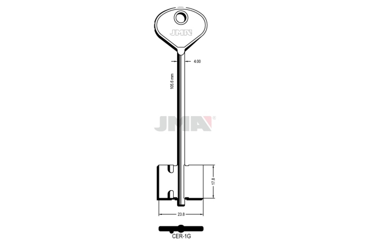 Заготовка ключа JMA CER1G/5CER7(S) — металева заготовка для виготовлення надійних дублікатів ключів, що забезпечує стабільну роботу замкового механізму та точну посадку.