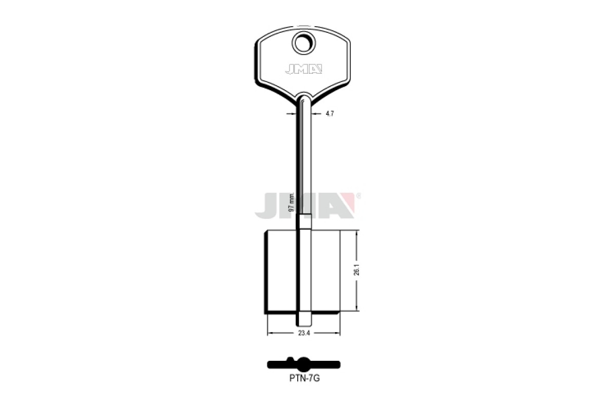 Заготовка ключа JMA PTN 7G/5 PT 2(S) — металева заготовка для точного виготовлення дублікатів ключів, що забезпечує правильну посадку та стабільну роботу замкового механізму.