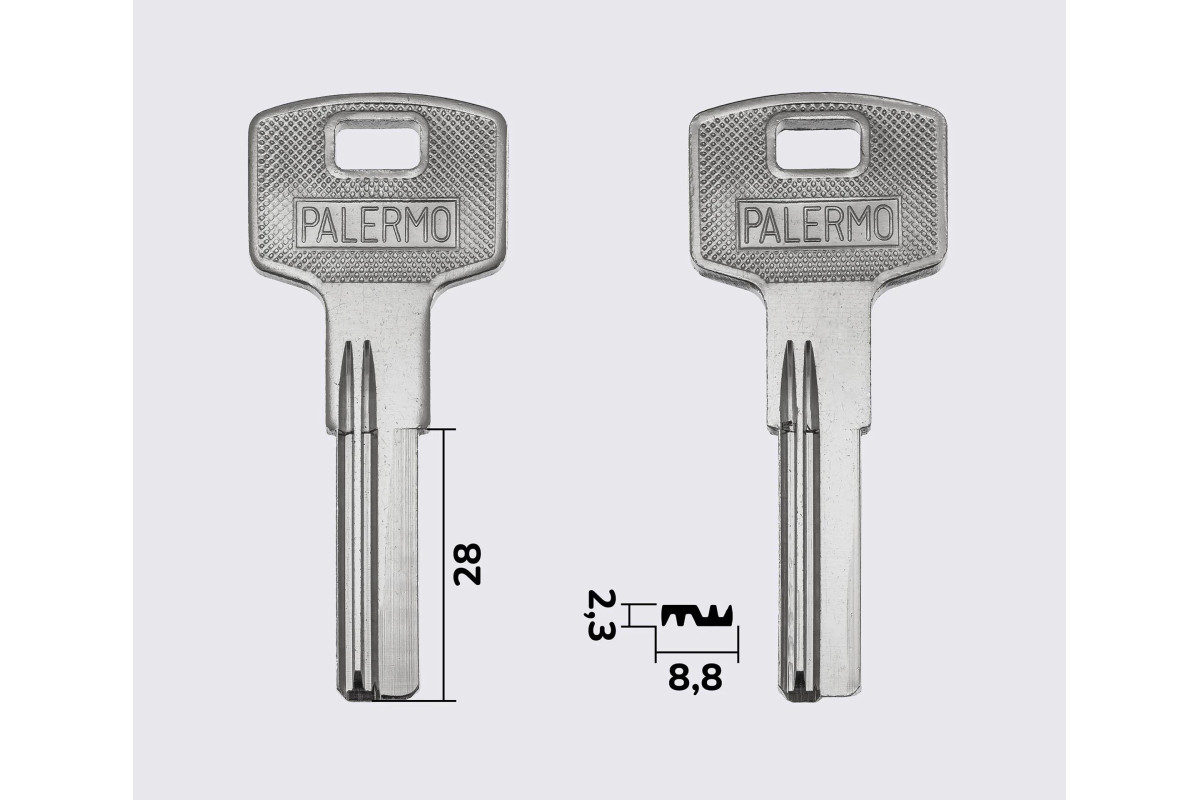 Заготовка ключа PALERMO — високоточна металева заготовка для виготовлення надійних дублікатів ключів, що гарантує стабільну роботу замкового механізму та довготривале використання.